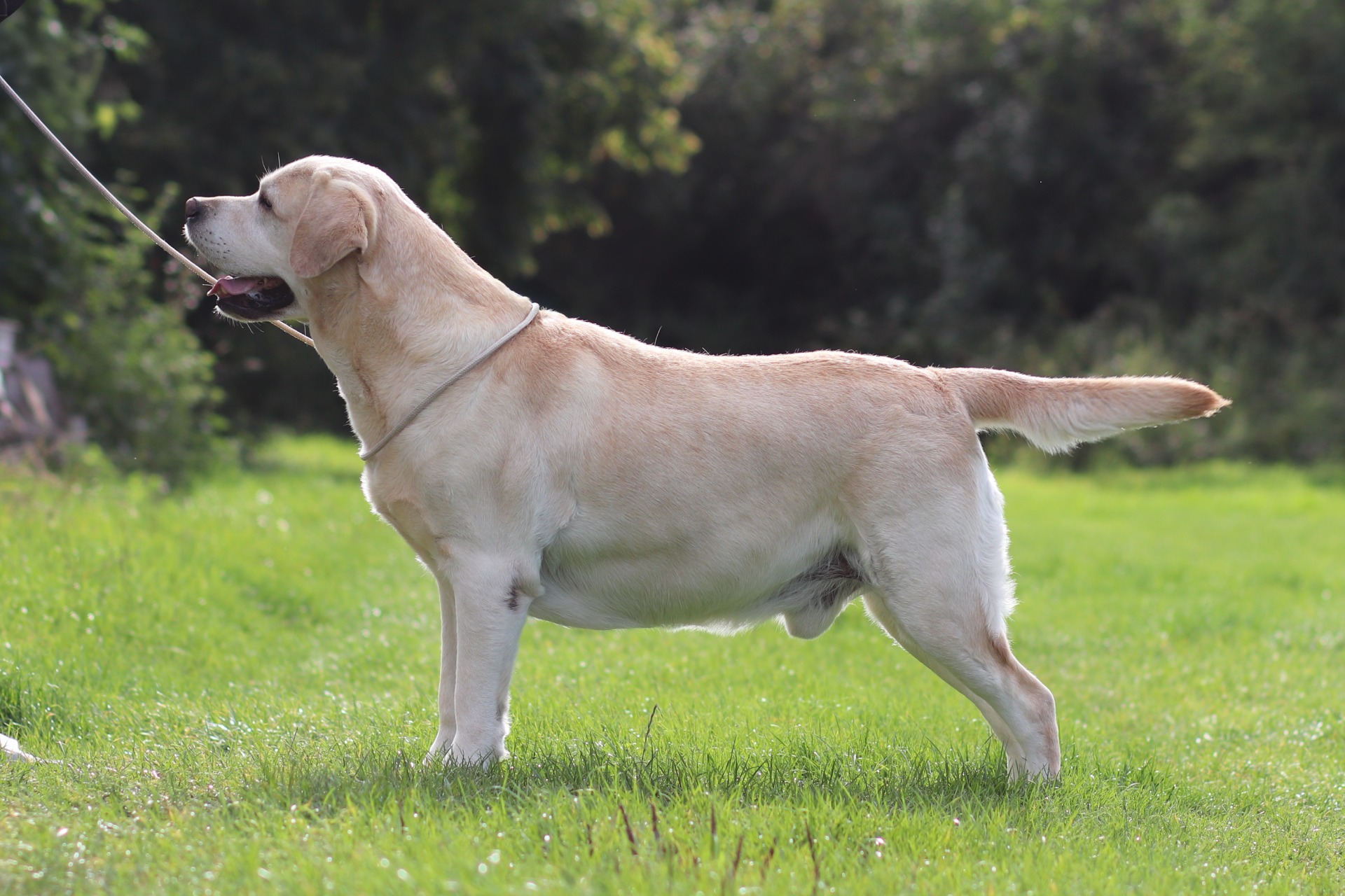 Yellow male, medium-strong bone structure, lovely expression, correct scissor bite, full dentition, dark eyes, good pigmentation, well-set ears, strong neck, excellent topline and underline, firm straight back, correctly set tail, excellently arched ribs, excellent forechest, deep chest, correct angulation of both front and rear limbs, excellent spacious movement with perfect action of legs, sweet temperament, a typical representative of the breed